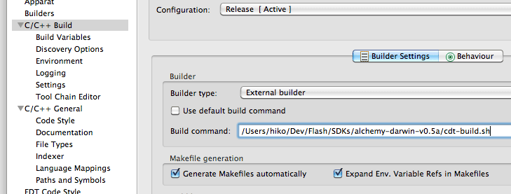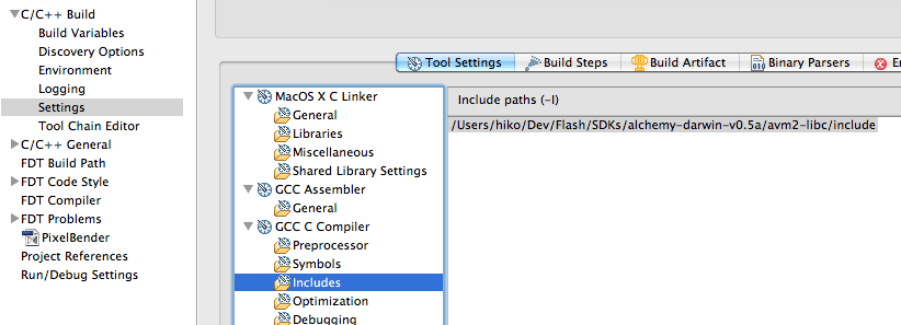 - Add include path ($ALCHEMY_HOME/avm2-libc/include) to "GCC C Compiler/Includes" section in "C/C++ Build - Settings" page.