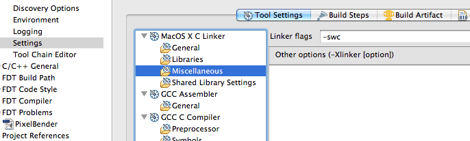- Add linker flag "-swc" at "MacOS X C Linker/Miscellaneous" section.