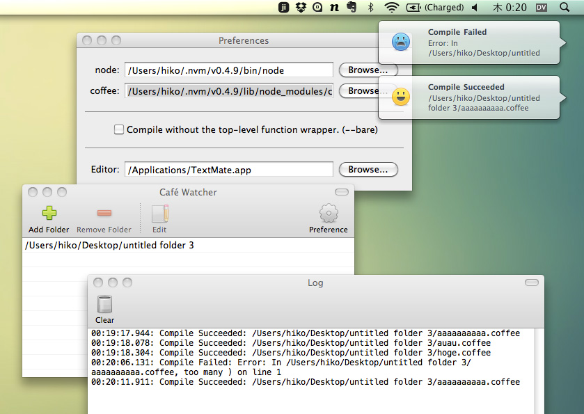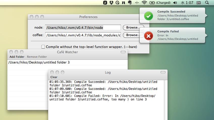 久しぶりに Cocoa アプリを書きました。このところ CoffeeScript と Python をわりとよく書いているです。これとか。まあそんなにたいした量でもないけれど。CoffeeScript よいね、シンプルきれい。けど、いちいちコンパイルするんめんどくさいの。いちおうコンパイラにはフォルダ監視して変更あったらコンパイルっていう watch オプション (-w) あるのだけど、コマンドラインでしかうごかねいしエラーがエディタの裏で出ててきづかねえとか、まあ、微妙なので、GUI でエラーを Growl でっていうのを作った次第。とりあえず使えるレベルまで作ったのでソースを Github へ。コンパイルされた js をさらに Closure Compiler でコンパイルー、とか、Stylus にも対応させたい。ちゅーかもうちょっと気の利いた名前と素敵なアイコンが欲しい。