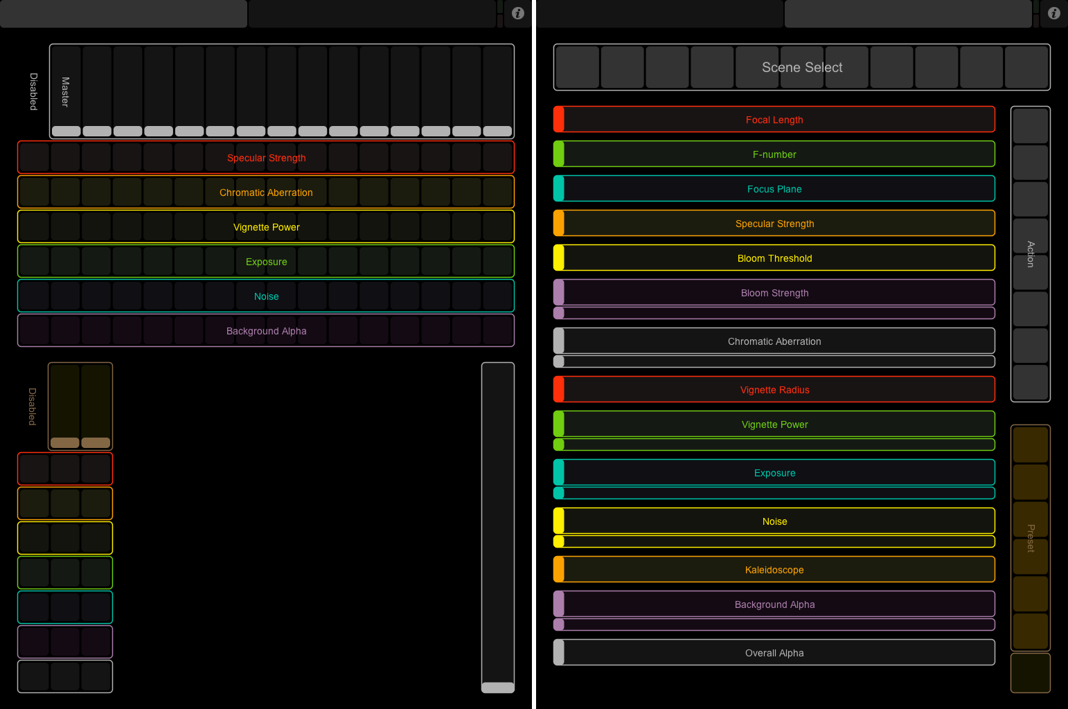 要素的には、被写界深度 / HDR / ガンマ補正 / 色収差 / Bloom / Vignette / FFT / MIDI / OSC てなとこかな。