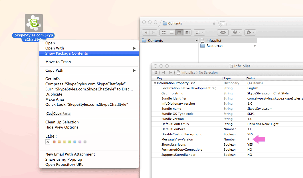 Skype 6 にしたら SkypeStyle.com がつかえへんくなったので、パッケージをひらいて Info.plist のなかの MessageViewVersion を 6 から 7 に変えてインストールしなおしたら使えるようになりましたっていうはなし。