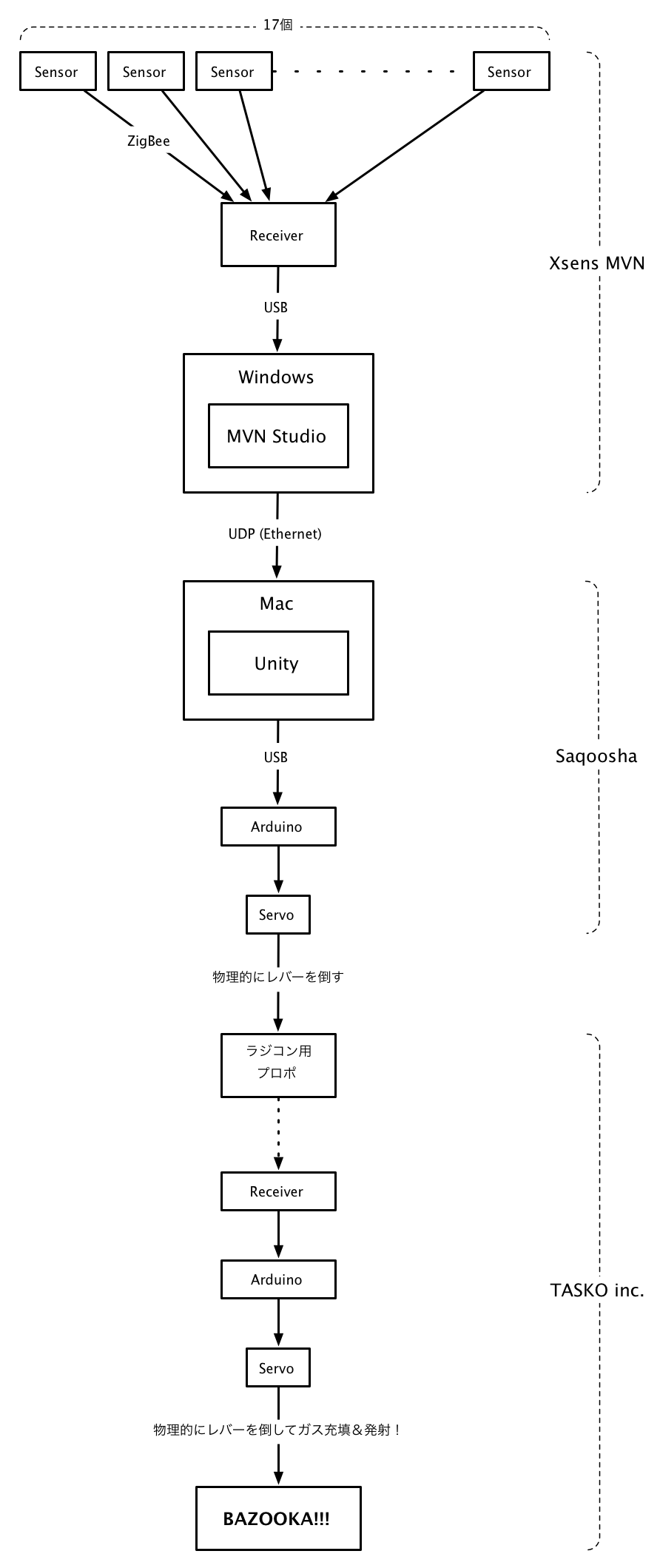 モーションを解析するパート(ここ、 Saqoosha がプログラム書いたとこ)は Unity で。MVN は別マシンの Windows で動いてるんだけど、そっから UDP で送られてくるデータをうけとって Unity 上のスケルトンに反映させて動き解析する。データ受け取ってスケルトンに反映させるってとこまでは、Asset がすでに用意されてるので自分でなにか書く必要はまったくなし。書いたのはほんとモーション解析とバズーカへの指示出しだけ。モーション解析は解析ってほど複雑なことはやってなくて(じつはそのせいで誤射多かったんだけど、、)頭と胸と手に RigidBody つけてそれぞれの当たり判定具合でいい感じに発射。