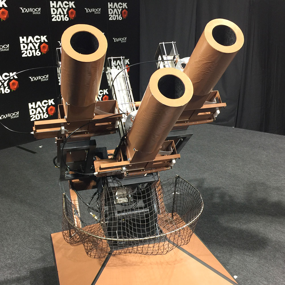っつーことで、もうだいぶん前の話になるけど Yahoo! JAPAN 主催の日本最大級ハッカソンイベント「Hack Day 2016」の PR 企画のひとつとして、dot by dot inc. と TASKO inc. とで、「愛のチョコバズーカ」なるものを制作しましたー。これは篠崎愛さんのダンスパフォーマンスをリアルタイムにモーションキャプチャして、その動きを解析して特定のアクションをしたら自動的にバズーカからチョコが発射される、っていうシステム。イベントが 2/14 でバレンタインだし投げキッスしたらくちびるがそのままチョコになって飛んでったらえんちゃう?っていうアイデアが発端。