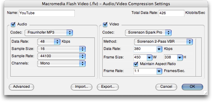 以上の実験結果から考えてみた YouTube に最適なエンコードの設定がこちら。(Sorenson Squeeze のだけど。)