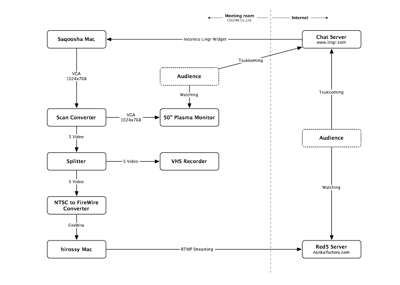 第4回 大阪てら子「さくーしゃのFlashライヴコーディング」を 6/17 の日曜日にやるですが、会場に来れない人向けにライブ中継してみよーってことになりました。(ぽろっと言ったことが現実に。) システムは hirossy 制作。さんくす。